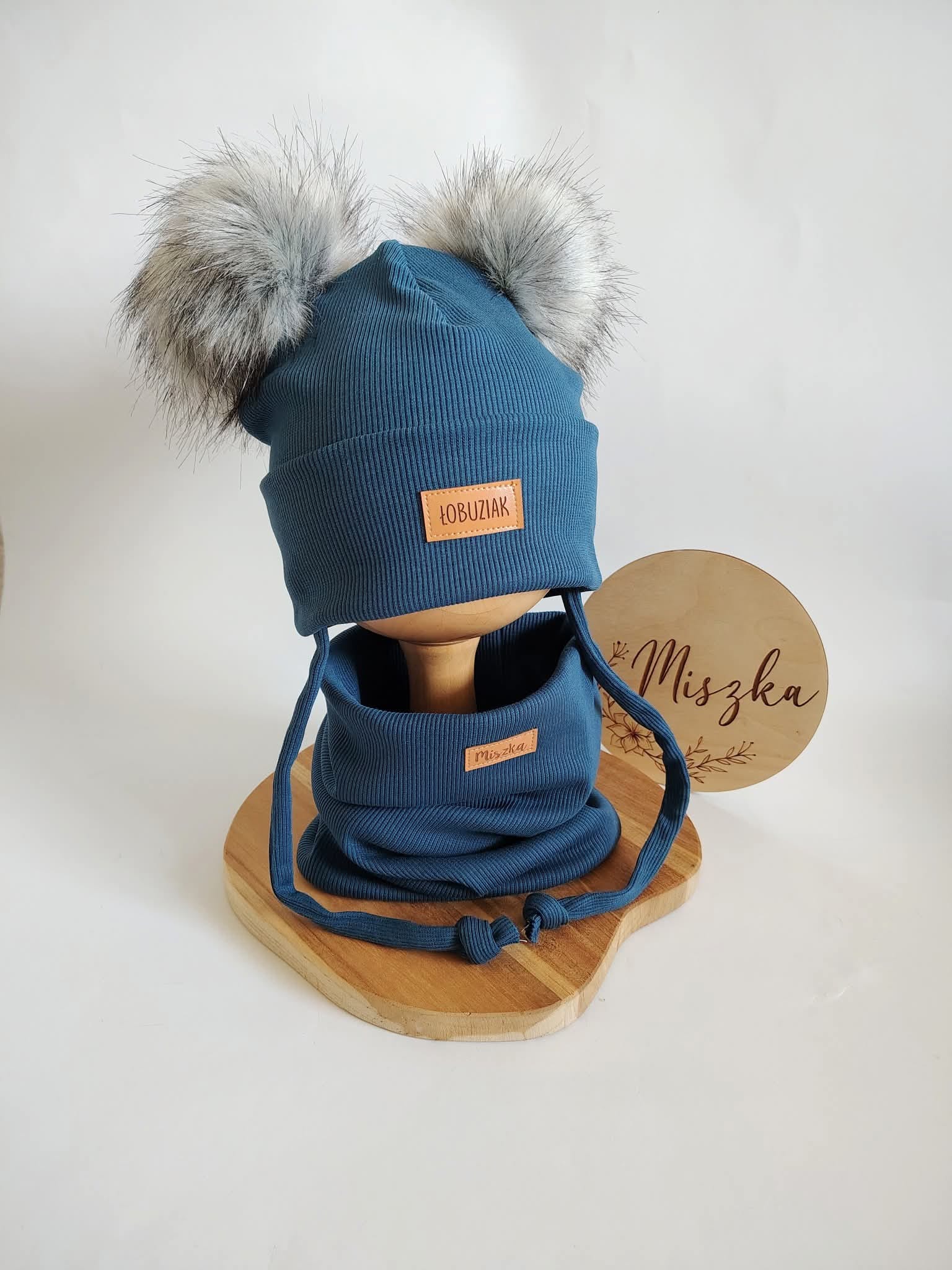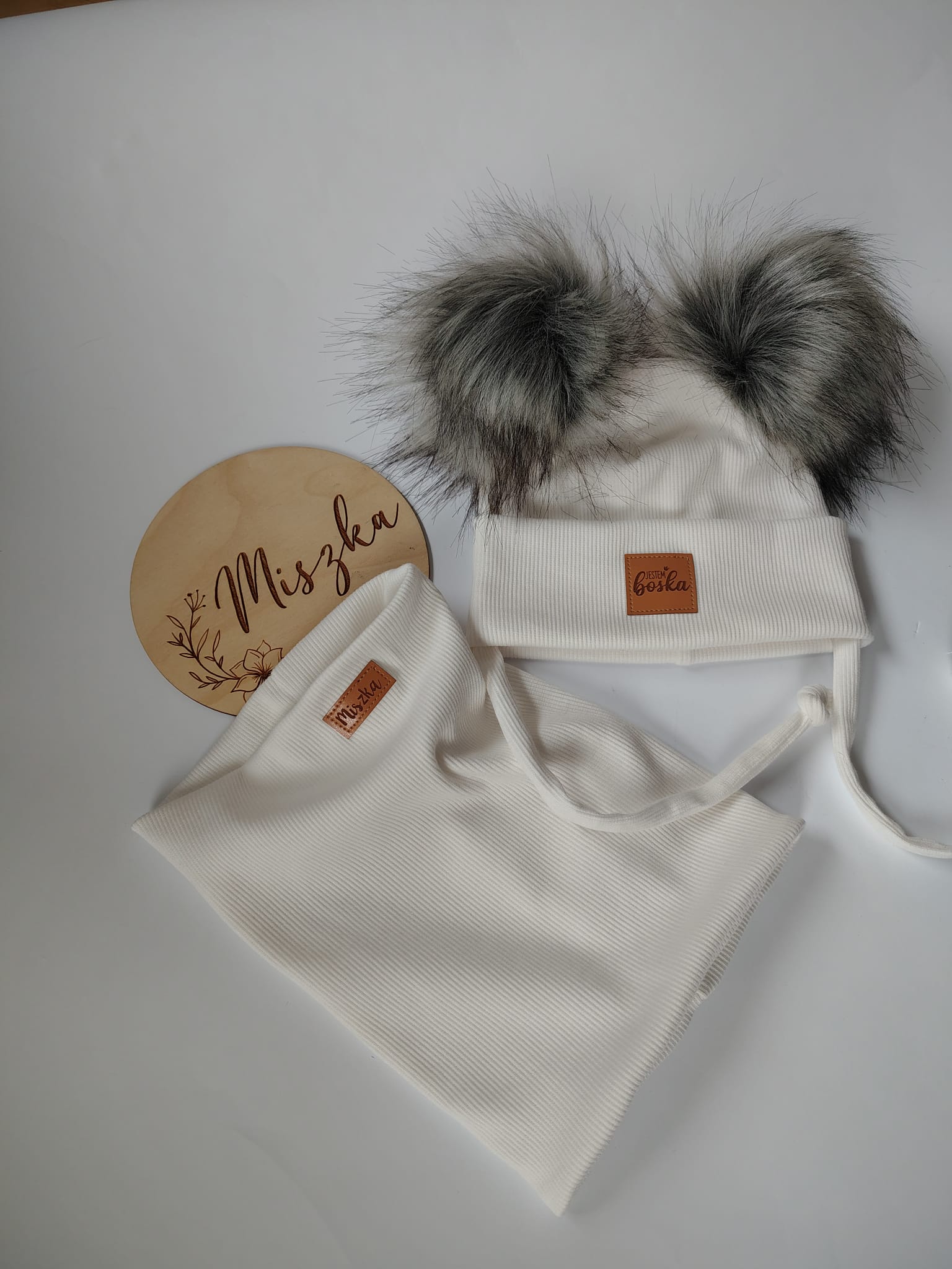 Skład zestawu Mięciutki komin – delikatny i przyjemny w dotyku, świetnie chroni szyję dziecka przed chłodem i wiatrem.